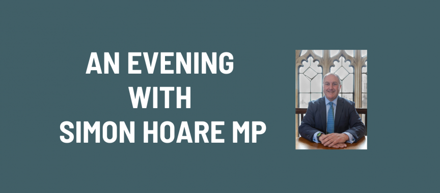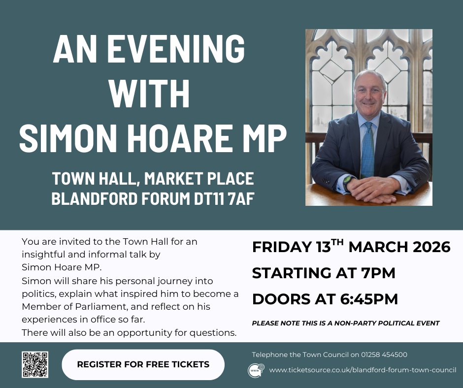 You are invited to the Town Hall on Friday 13th March 2026 from 7:00pm for an insightful and informal talk by Simon Hoare MP.