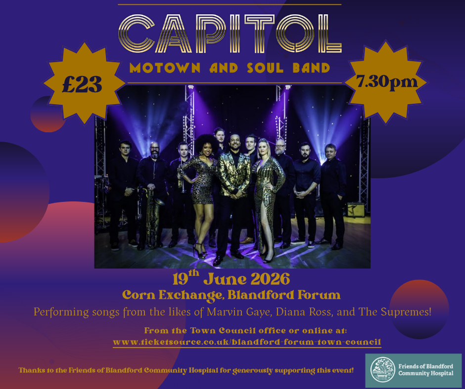 Friday 19th June-Capitol Motown and Soul Band! Tickets available from the office or at www.ticketsource.co.uk/blandford-forum-town-council