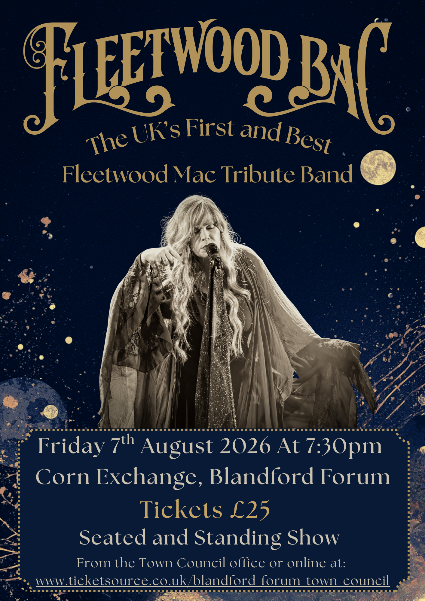 Friday 7th August 2026 – Fleetwood Bac (Fleetwood Mac tribute band) Tickets available from the office or at https://www.ticketsource.co.uk/blandford-forum-town-council