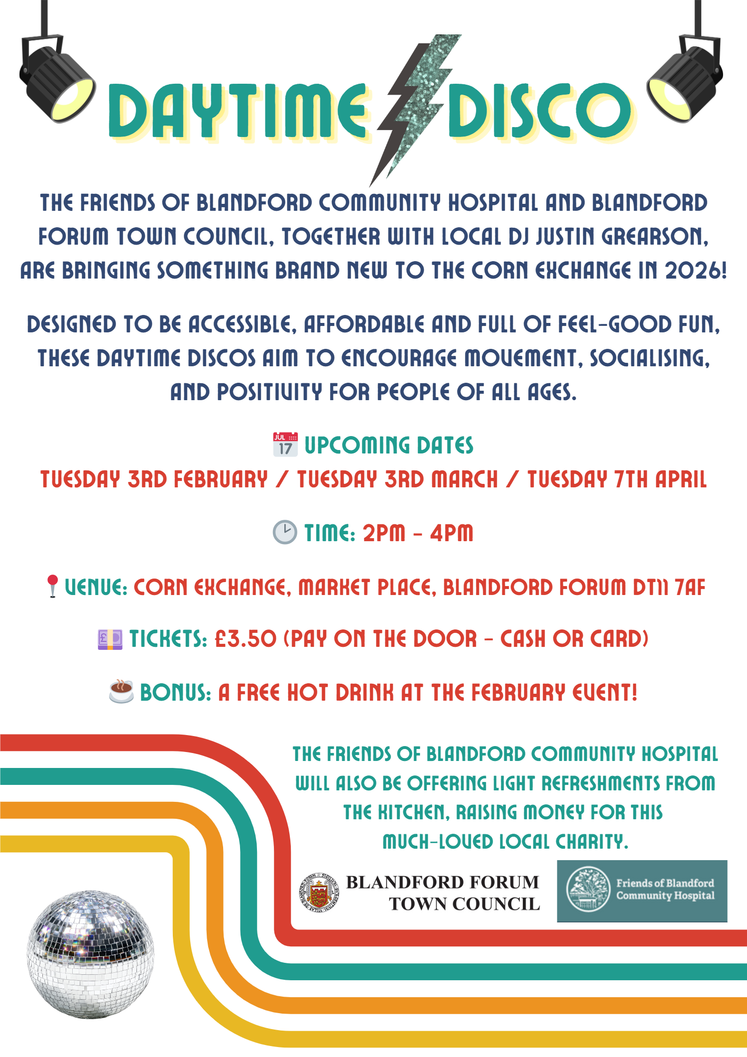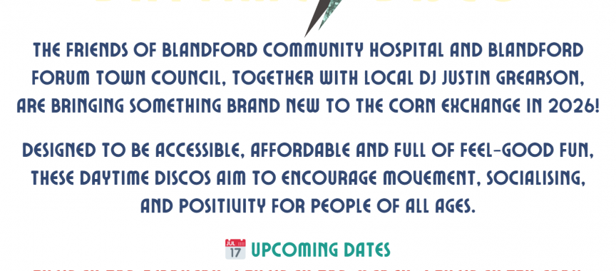 The Friends of Blandford Community Hospital and Blandford Forum Town Council, together with local DJ Justin Grearson, are bringing something brand new to the Corn Exchange in 2026 — a daytime disco!
